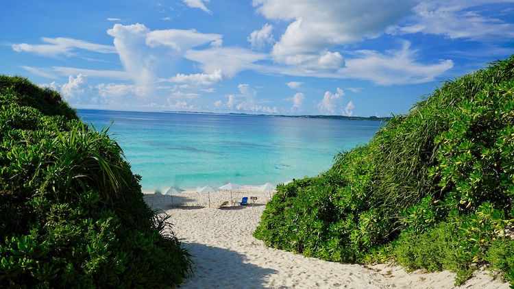 8月19日午前中は来間島の長間浜ビーチへ駐車場は10台ほどそのおかげでひとは少ないです。砂浜と海の間に岩場がありますがオブジェとして見れば -